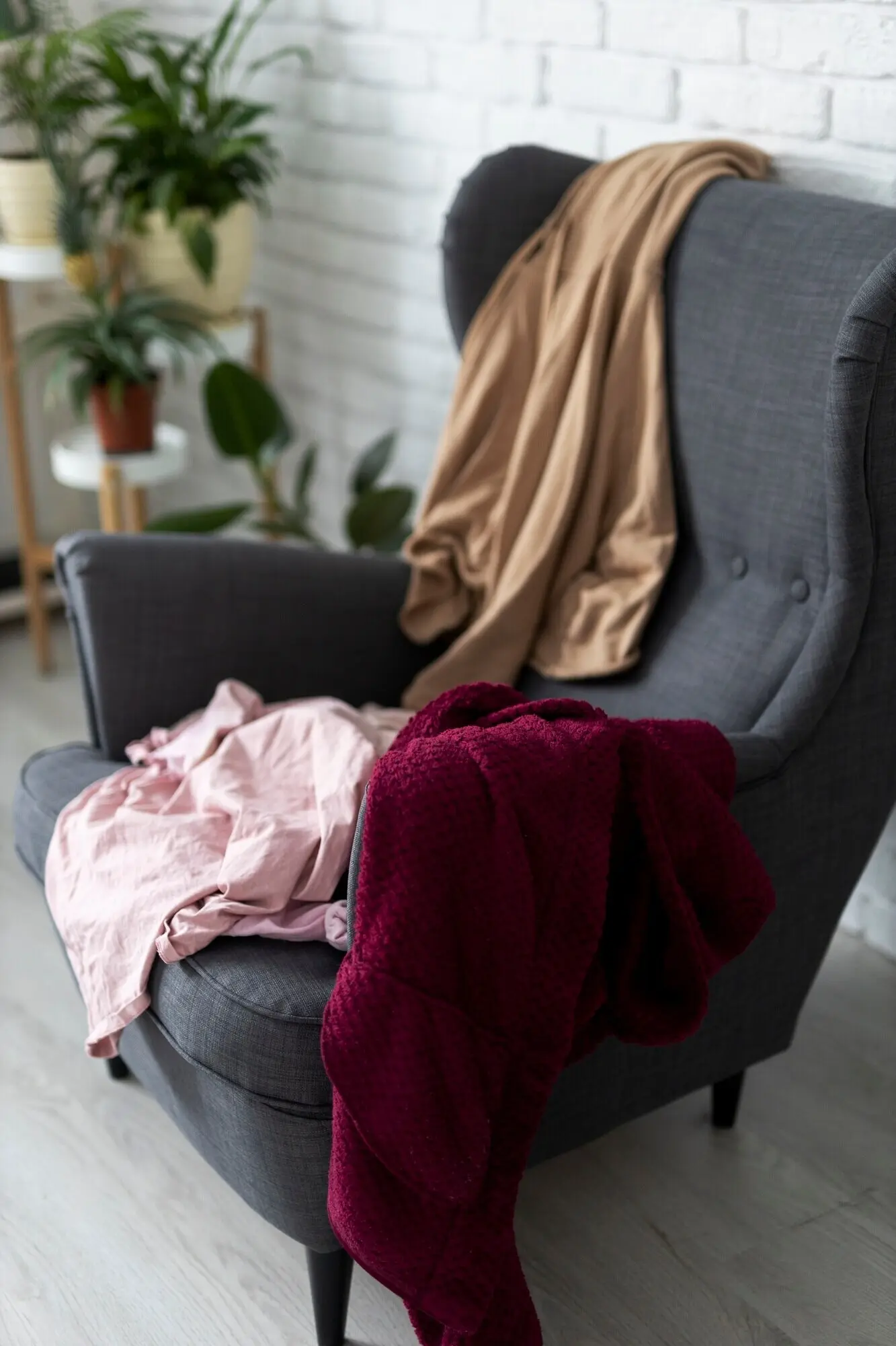 Eine alte Malerleiter, gründlich gereinigt und ausgesteift, verwandelte sich mit drei Eichenböden in ein luftiges Regal. Die Stufen tragen leichte Fächer, oben hängt eine kleine Leselampe. Zwischenräume lassen Wände atmen, Bücher wirken fast schwebend. Ein kurzer Anker gegen Kippen, Filz an Wandkontaktpunkten, matte Ölbehandlung – fertig. Das Möbel vermittelt Zartheit statt Masse, ordnet Lieblingsbände und lässt das Zimmer größer wirken, ohne die ruhige, erdende Stimmung zu stören.